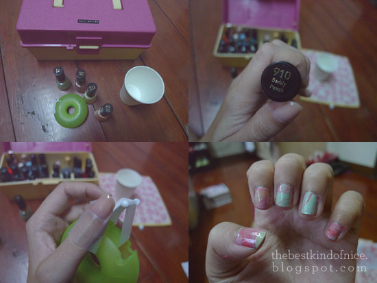 For the marble nails, you’ll need a cup of water, your choice of 2 to 3 colors of polish, some tape, and an orange stick (I used a barbecue stick). You can follow the tutorial for marble nails on Refinery29. Here’s how mine turned out the first time: