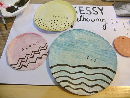 Used watered down acrylic paint and letter stamps on my plates. The smallest one was for swapping at the end of the afternoon.