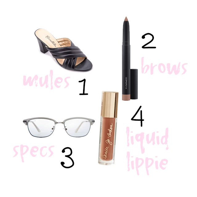 1 The comfiest heeled mules from Carmelletes · 2 Big Brow Pencil in Lingering from MAC · 3 The Wes from Sunnies Specs · 4 Glam Squad liquid matte lipstick in Naked Peach by Denise Go-Ochoa from Happy Skin